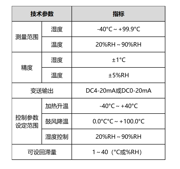 该温湿度控制器以数码管方式显示温湿度值,有加热器、传感器故障指示、变送功能、带有RS485通讯接口可供远程监控,用户可通过按键编程自行设定系统参数。该仪表集测量、显示、控制及通讯于一体,精度高、测量范围宽,是一种适合于各个行业和领域的温湿度测量控制仪表。